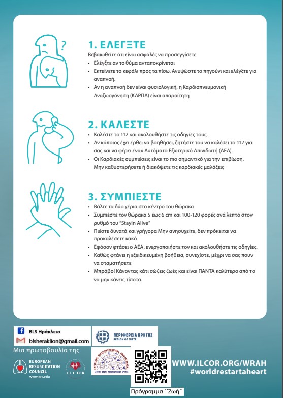 Με αφορμή τον εορτασμό της Παγκόσμιας Ημέρας Επανεκκίνησης της Καρδιάς, το Εργαστήριο Καρδιοπνευμονικής Αναζωογόνησης της Ιατρικής Σχολής του Πανεπιστημίου Κρήτης και η Περιφέρεια Κρήτης συνδιοργανώνουν εκδήλωση για τον εορτασμό της Παγκόσμιας Ημέρας.