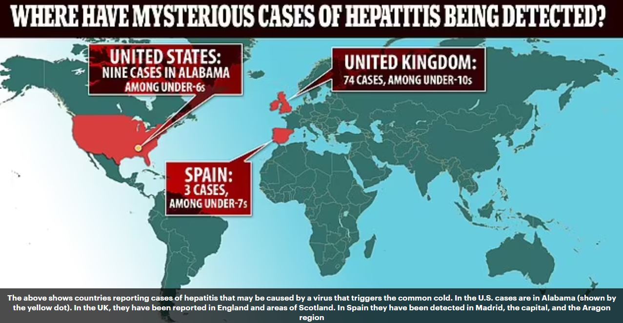 Στην Ισπανία οι αρχές ανέφεραν στις 13 Απριλίου τον εντοπισμό τριών σοβαρών κρουσμάτων σε παιδιά 2 έως 13 ετών σε διαφορετικές περιοχές (Μαδρίτη, Αραγωνία, Καστίλλη-Λα Μάντσα), ενώ παιδίατροι σε Ολλανδία και Δανία ανέφεραν επίσης παρόμοιες περιπτώσεις βαριάς παιδικής ηπατίτιδας που χρειάζονται και μεταμόσχευση ήπατος.