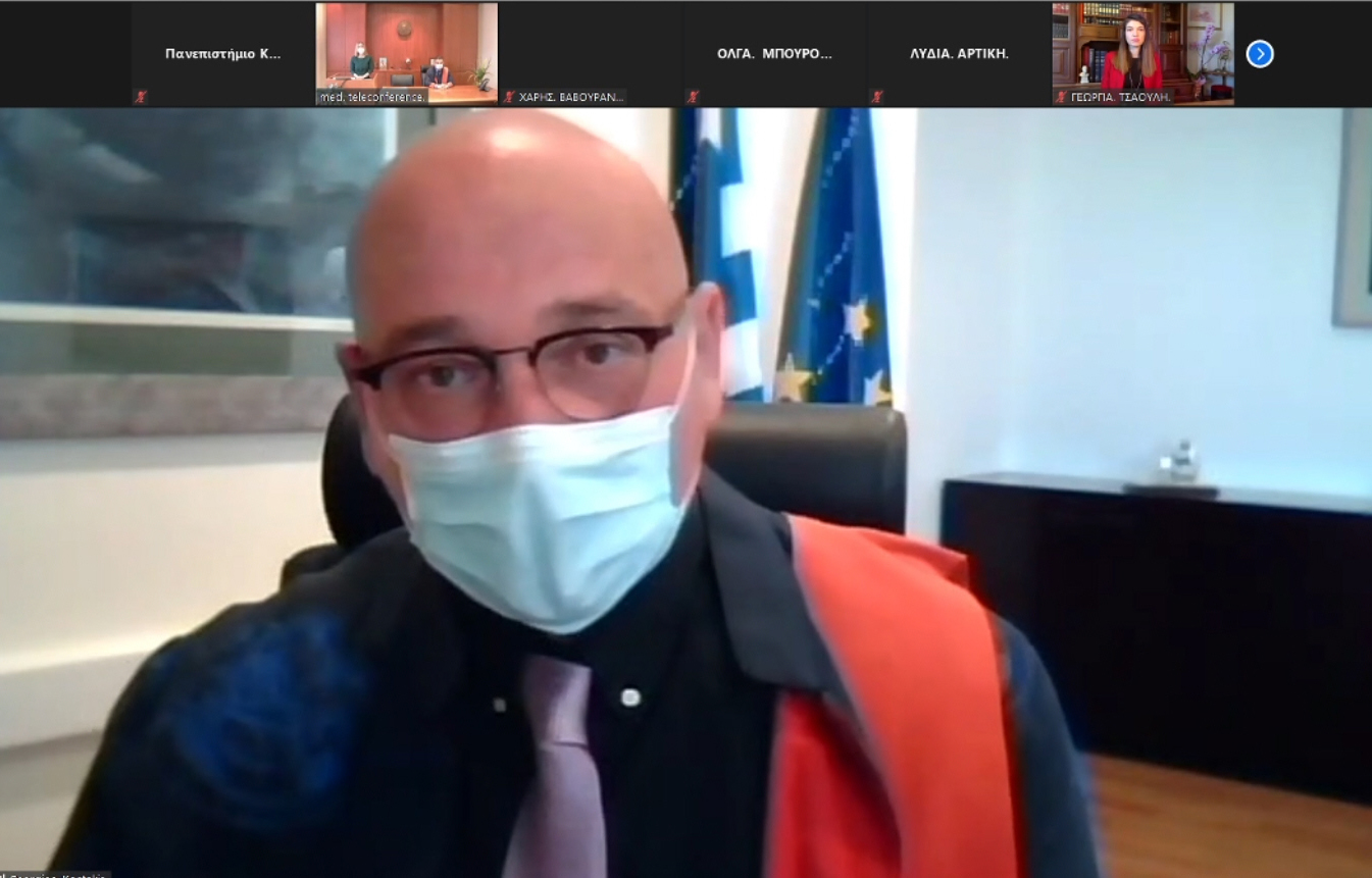 Ο Πρύτανης του Πανεπιστημίου Κρήτης, Καθηγητής Γ. Μ. Κοντάκης, ο Πρόεδρος του Ιατρικού Συλλόγου Ηρακλείου, κ. Χ. Βαβουρανάκης, οι υποψήφιοι διδάκτορες, οι απόφοιτοι των Προγραμμάτων Μεταπτυχιακών Σπουδών και οι απόφοιτοι της Ιατρικής Σχολής συμμετείχαν διαδικτυακά.