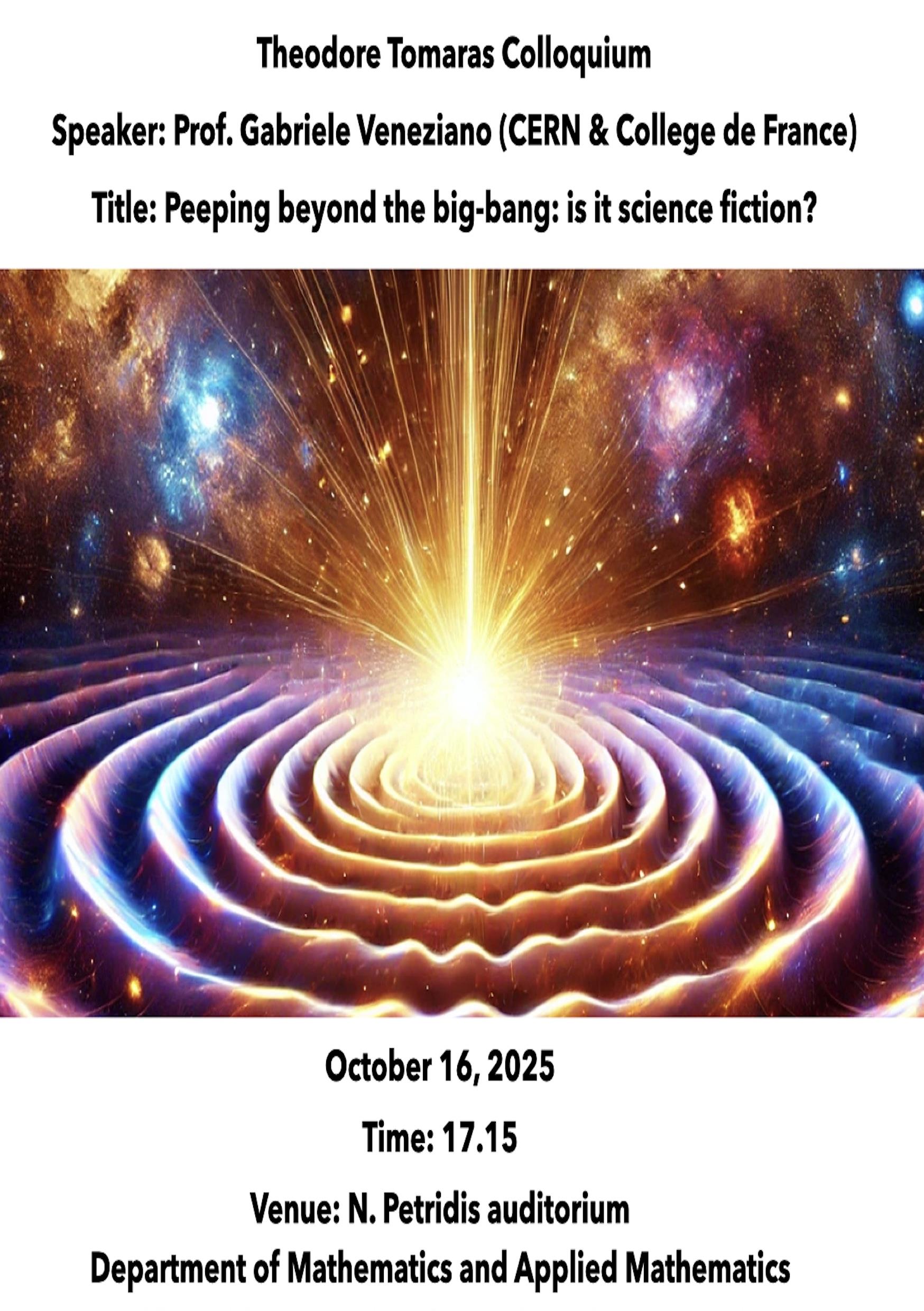 Η φετινή διάλεξη «ΘΕΟΔΩΡΟΣ ΤΟΜΑΡΑΣ» θα γίνει στις 16 Οκτωβρίου 2025, στις 17:15 στο αμφιθέατρο Ν. Πετρίδη του τμήματος Μαθηματικών του Πανεπιστημίου Κρήτης. Ομιλητής θα είναι ο Καθηγητής Gabriele Veneziano από το CERN και το Collège de France. Η ομιλία του έχει τίτλο: