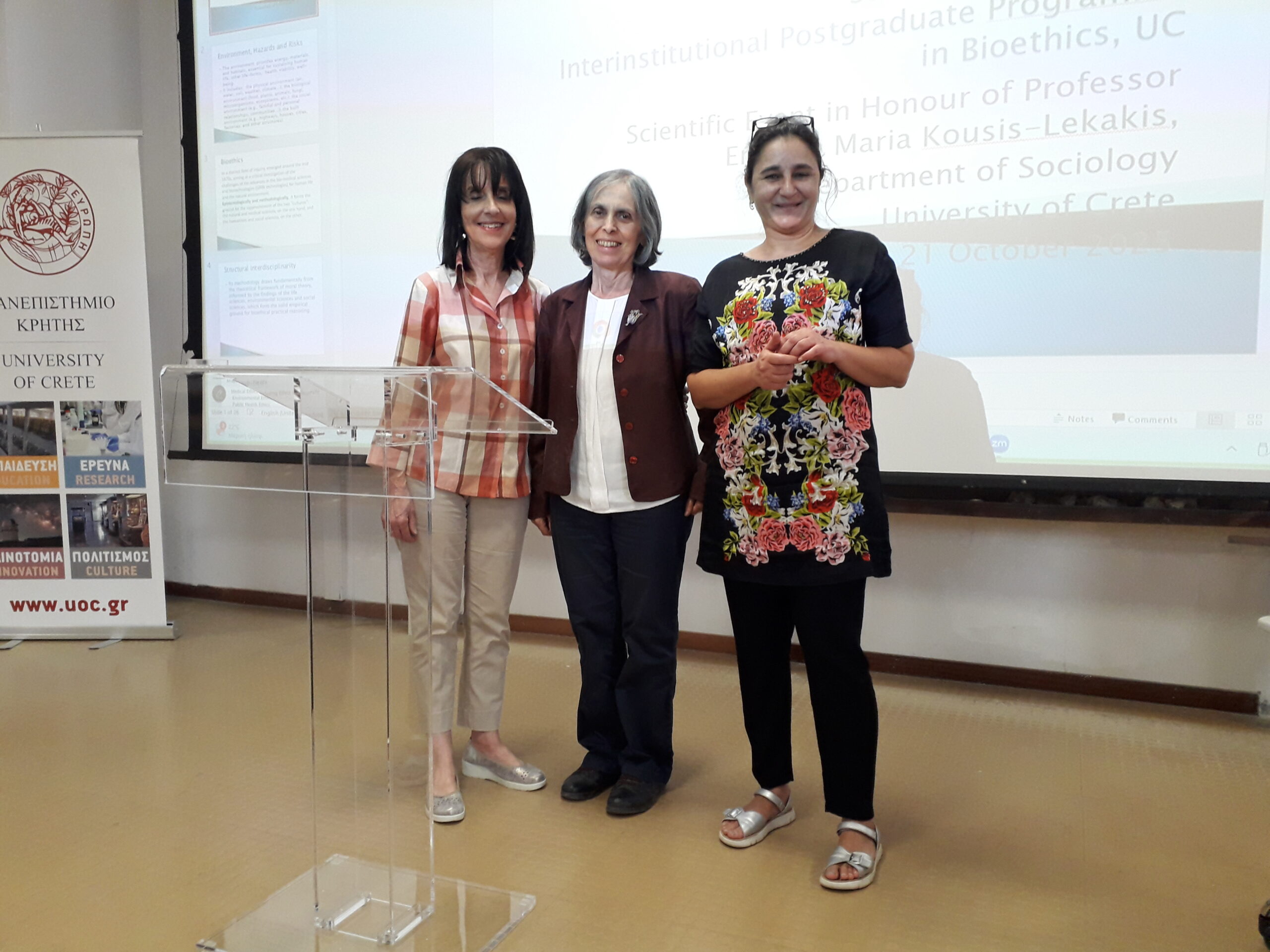 Την παρουσίαση της προσωπικότητας και του επιστημονικού έργου της τιμώμενης έκαναν οι Καθηγήτριες του Τμήματος Στεφανία Καλογεράκη και Βασιλική Πετούση, οι οποίες σκιαγράφησαν τη σταδιοδρομία της κας Μ. Κούση Λεκάκη και το σημαντικό επιστημονικό και ερευνητικό της έργο που τυγχάνει διεθνούς αναγνώρισης και διακρίσεων. Παράλληλα, αναδείχτηκαν η συμβολή της στην ακαδημαϊκή κοινότητα της χώρας και την επιστήμη γενικότερα, αλλά και η σημαντική και πολυεπίπεδη προσφορά της στο Τμήμα Κοινωνιολογίας και το Πανεπιστήμιο Κρήτης σε διδακτικό και διοικητικό επίπεδο.