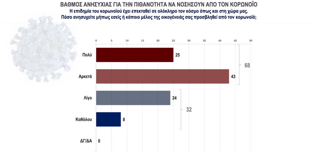 Οι πολίτες που συμμετείχαν στη δημοσκόπηση δηλώνει σε ποσοστό 68% ότι ανησυχούν πολύ (25%) ή αρκετά (43%) ότι θα νοσήσουν από τον κορονοϊό, ενώ το 32% απαντά λίγο (24%) ή καθόλου (8%). Κανείς απ’ όσους ρωτήθηκαν δεν ήταν θετικός στον κορονοϊό. Το 5% πιστεύει πως προσβλήθηκε αλλά δεν επιβεβαιώθηκε αυτό στο τεστ, το 91% δεν πιστεύει πως έχει κολλήσει.