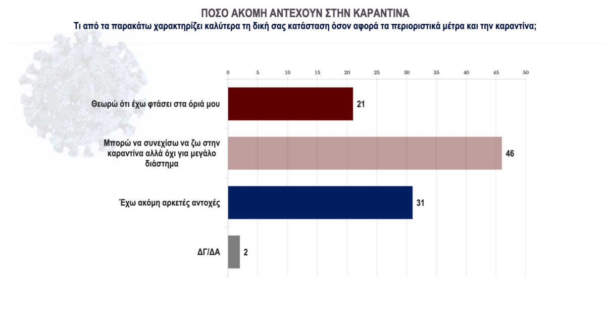 Οι περισσότεροι από τους ερωτηθέντες πάντως βγάζουν μια… αντοχή στην καραντίνα. Στο ερώτημα για το πόσο ακόμη αντέχουν την καραντίνα, το 21% θεωρεί πως έχει φτάσει στα όριά του, το 46% πως μπορεί να συνεχίσει αλλά όχι για μεγάλο διάστημα και το 31% πως έχει ακόμα αρκετές αντοχές.