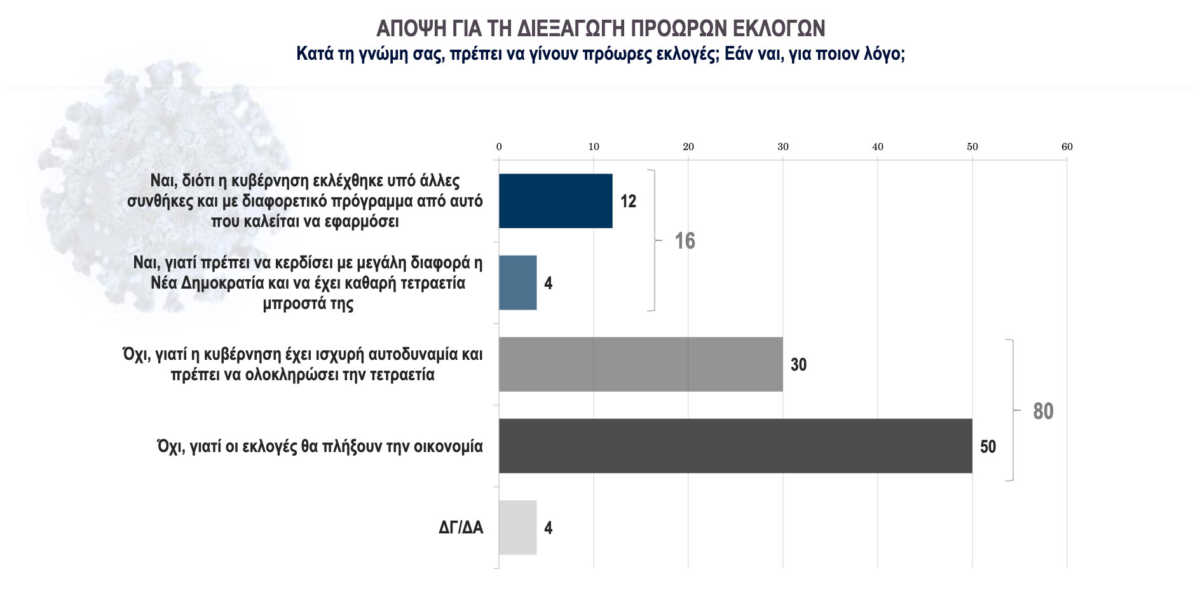 Τις οποίες (εκλογές) δεν θέλουν. Σε ποσοστό 80%, οι πολίτες δεν θέλουν κάλπες. Το 50% θεωρεί ότι οι εκλογές θα πλήξουν την οικονομία και το 30% δεν θέλει εκλογές γιατί «γιατί η κυβέρνηση έχει ισχυρή αυτοδυναμία και πρέπει να ολοκληρώσει την τετραετία». Αντίθετα, «ναι» στις κάλπες λέει το 16% των ερωτηθέντων στη δημοσκόπηση.