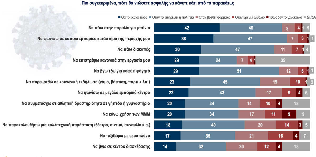 Εκείνο που θέλουν οι περισσότεροι όταν τελειώσει η καραντίνα και νιώσουν ασφαλείς να επιστρέψουν στην καθημερινότητά τους είναι να πάνε για μπάνιο (82%), να πάνε να ψωνίσουν σε μαγαζί της περιοχής τους (85%), να πάνε διακοπές (77%), να πάνε για καφέ ή φαγητό (80%). Κι εδώ πάντως υπάρχουν κι εκείνοι που ακόμη κι αν η κυβέρνηση άρει τα περιοριστικά μέτρα είναι διστακτικοί στο να πάνε σε νυχτερινό κέντρο (54%), να ταξιδέψουν με αεροπλάνο (48%), να μπουν σε μέσα μαζικής μεταφοράς (46%), να πάνε στο γήπεδο ή στο γυμναστήριο (46%).