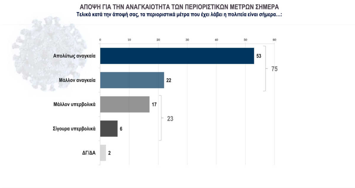 Για το 75% των ερωτηθέντων η κυβέρνηση πρέπει να ξεκινήσει στις αρχές Μαΐου τη σταδιακή άρση των περιοριστικών μέτρων, με το 19% να έχει την αντίθετη άποψη.
