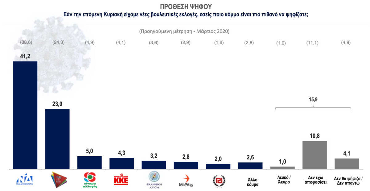 Αν πάντως γίνονταν την Κυριακή εκλογές, η Νέα Δημοκρατία θα κέρδιζε σε ποσοστό 41,2%. Η διαφορά της από τον ΣΥΡΙΖΑ είναι μεγάλη, αφού το κόμμα της αξιωματικής αντιπολίτευσης ακολουθεί με 23%. Τρίτο κόμμα είναι το ΚΙΝΑΛ με 5% και ακολουθούν: ΚΚΕ με 4,2%, Ελληνική Λύση με 3,2%, ΜέΡΑ25 με 2,8%, Χρυσή Αυγή με 2% και “Άλλο κόμμα” 2,6%. Οι αναποφάσιστοι είναι σχεδόν 11%.
