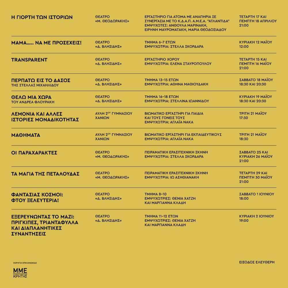 α)Εργαστήριο για άτομα με αναπηρία σε συνεργασία με το Κ.δ.α.π. Α.μ.ε.α. “Ατλαντίδα” (εμψυχωτές Ανθούλα Μαρινάκη, Ειρήνη Μαυροματάκη, Μαρία Θεοδοσιάδου) “Η γιορτή των ιστοριών” Τετάρτη 17 και Πέμπτη 18 Απριλίου, Θέατρο «Μ. Θεοδωράκης» στις 21:00
