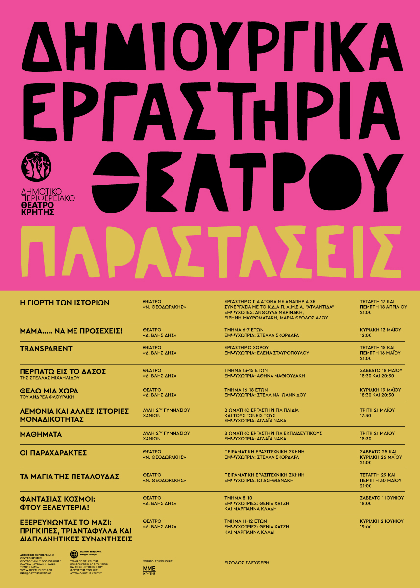 Το Δημοτικό Περιφερειακό Θέατρο Κρήτης με την ολοκλήρωση του φετινού κύκλου των μαθημάτων, σας προσκαλεί να παρακολουθήσετε τις παρουσιάσεις των εργασιών των εργαστηρίων, που οργανώνει για 18η συνεχόμενη χρονιά, στο πλαίσιο των εκπαιδευτικών δραστηριοτήτων του.