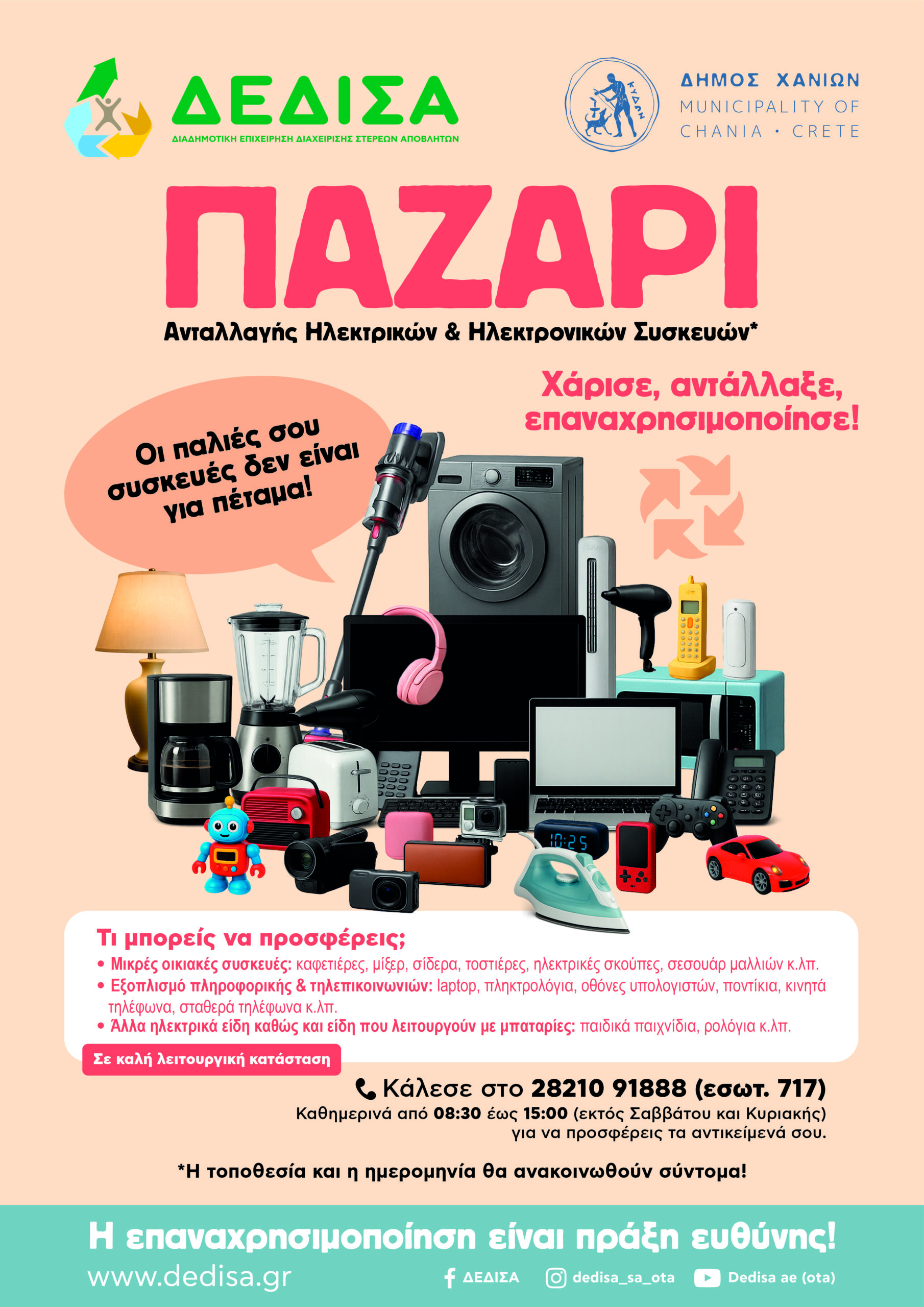 Η Διαδημοτική Επιχείρηση Διαχείρισης Στερεών Αποβλήτων [ΔΕΔΙΣΑ Α.Ε. (ΟΤΑ)] και ο Δήμος Χανίων, στο πλαίσιο της Ευρωπαϊκής Εβδομάδας Μείωσης Αποβλήτων (EWWR), διοργανώνουν Παζάρι «Ανταλλαγής» Ηλεκτρικών και Ηλεκτρονικών Συσκευών, με στόχο την προώθηση της επαναχρησιμοποίησης, τη μείωση των αποβλήτων και την ευαισθητοποίηση της κοινωνίας γύρω από την κυκλική οικονομία.