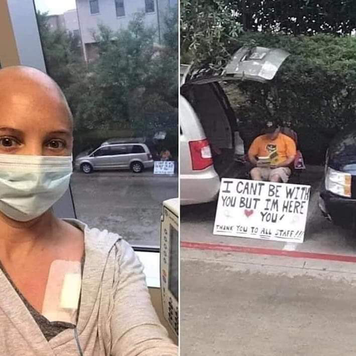Ο σύζυγός της παραμένει στο δρόμο έξω από το νοσοκομείο, απέναντι από το παράθυρο του δωματίου της, με μια πινακίδα που γράφει: «Δεν μπορώ να είμαι μαζί σου, αλλά είμαι εδώ και σε αγαπώ», ενώ ταυτόχρονα ευχαριστεί το προσωπικό του νοσοκομείου.