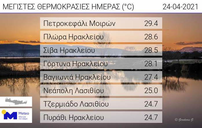 Σύμφωνα με τον Διευθυντή Ερευνών στο Εθνικό Αστεροσκοπείο Αθηνών, Κ. Λαγουβάρδο, οι 8 υψηλότερες τιμές θερμοκρασίας που κατέγραψαν οι σταθμοί του Εθνικού Αστεροσκοπείου Αθηνών/meteo.gr στο νησί δίνονται στον πίνακα που ακολουθεί.
