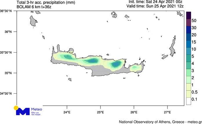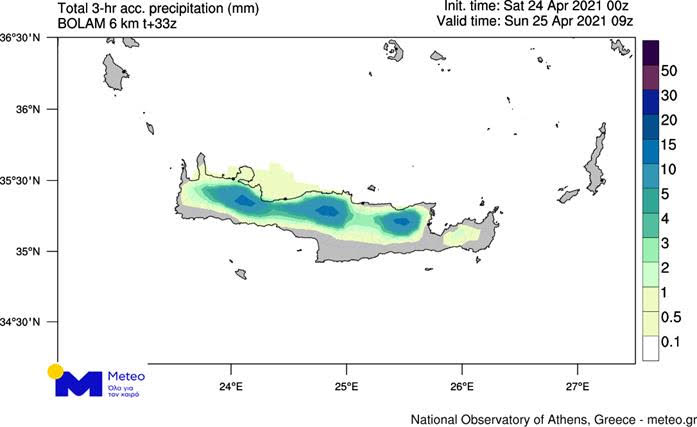 Την Κυριακή των Βαΐων όμως το σκηνικό του καιρού θα αλλάξει και στην Κρήτη, με αρκετές βροχές. Οι χάρτες που ακολουθούν δίνουν στιγμιότυπα από τα προβλεπόμενα ύψη βροχής την Κυριακή (πρωϊνές και πρώτες μεσημβρινές ώρες).