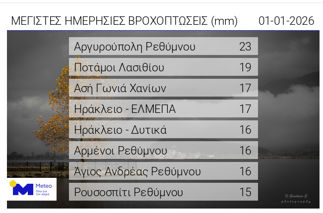 Σύμφωνα με το meteo.gr, μέχρι το πρωί της Πρωτοχρονιάς, τα μεγαλύτερα ύψη βροχής καταγράφηκαν στην Κρήτη.