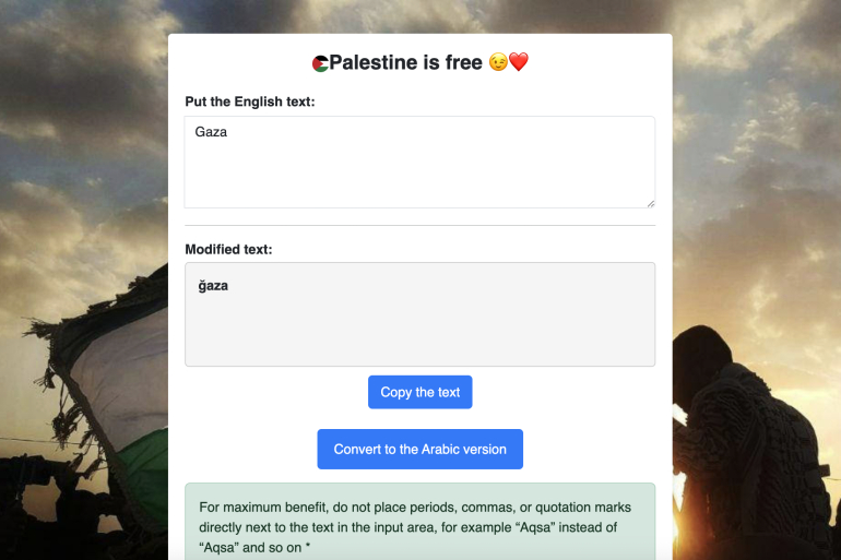 Ο Mohammad Darwish, 31 ετών, ιδρυτής της a Bydotpy, μιας εταιρείας blockchain με έδρα το Κάιρο της Αιγύπτου, δημιούργησε έναν ιστότοπο με την ονομασία «Free Palestine.bydotpy» που αυτοματοποιεί την ίδια διαδικασία. Πληκτρολογώντας «Gaza» στον ιστότοπό του, για παράδειγμα, αυτόματα το αλλάζει σε «ğaza», το οποίο οι χρήστες μπορούν στη συνέχεια να αντιγράψουν και να επικολλήσουν στην εφαρμογή κοινωνικής δικτύωσης της επιλογής τους.