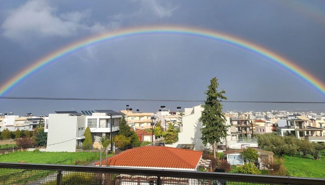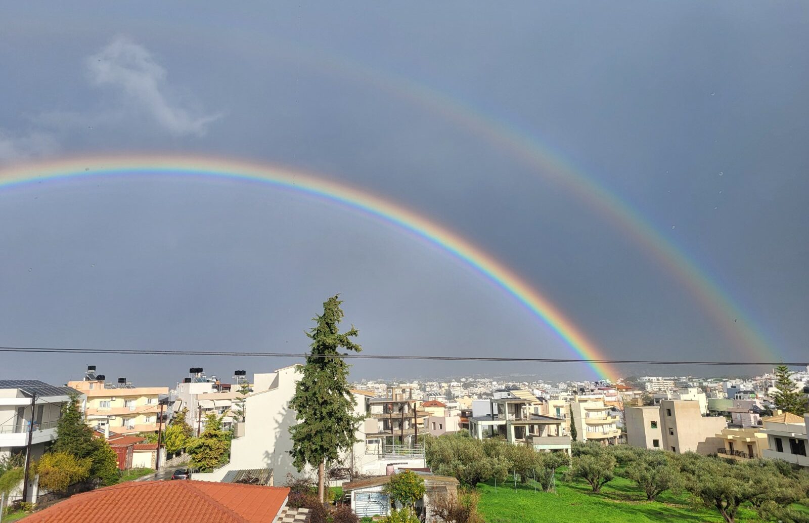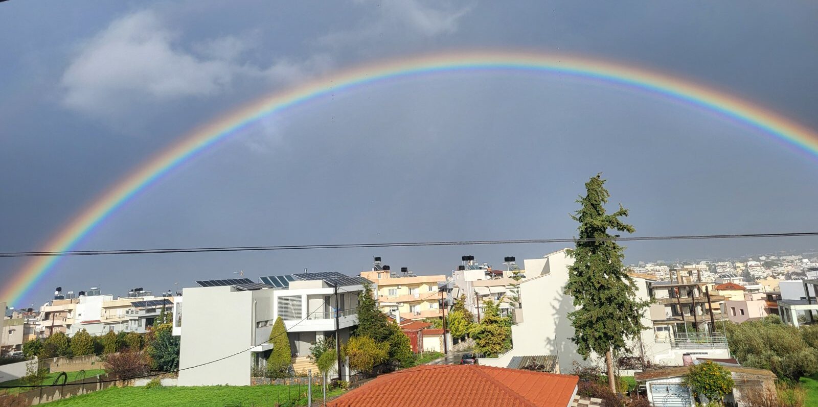 Μετά τη μεσημεριανή χαλαζόπτωση – εξπρές στο Ηράκλειο, ο σκοτεινός ουρανός απέκτησε χρώματα από το εντυπωσιακό ουράνιο τόξο.