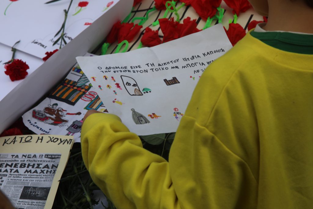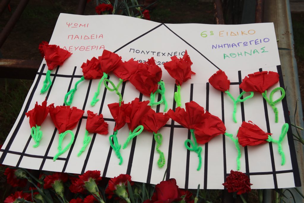 Τις πύλες του Πολυτεχνείου, που άνοιξαν στις 09:00 για να κλείσουν στις 13:00, πέρασαν πολίτες κάθε ηλικίας αφήνοντας στο μνημείο των θυμάτων της εξέγερσης κόκκινα γαρύφαλλα, μηνύματα αλλά και ζωγραφιές που κρατούσαν με καμάρι παιδάκια.