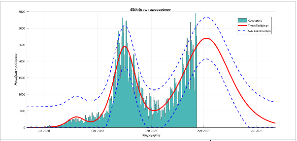Αναλύοντας τα δεδομένα από αρχές Ιουνίου 2020, τα οποία περιλαμβάνουν το 2ο και το 3ο κύμα, είναι δυνατό να εκτιμήσουμε τον χρόνο στον οποίο το τρέχον 4ο κύμα θα κορυφωθεί και θα επιβραδυνθεί ώστε να ακολουθήσει την πορεία προς την μείωση των κρουσμάτων σε πολύ χαμηλά διαχειρίσιμα επίπεδα. Οι μπλε διακεκομμένες καμπύλες στο σχήμα, δείχνουν το εύρος που μπορούν να κινηθούν τα ημερήσια κρούσματα το επόμενο διάστημα. Η συνεχόμενη κόκκινη καμπύλη δείχνει την εξέλιξη των κρουσμάτων του κορωνοϊού, η οποία υπολογίζεται από ένα αλγόριθμο, που επεξεργάζεται τον αριθμό των ημερήσιων κρουσμάτων. Τα δεδομένα επεξεργάστηκαν και απεικονίστηκαν κατά μήκος καμπανοειδών καμπυλών που τα ημερήσια δεδομένα δημιουργήσαν μέχρι την 20/03/2021.