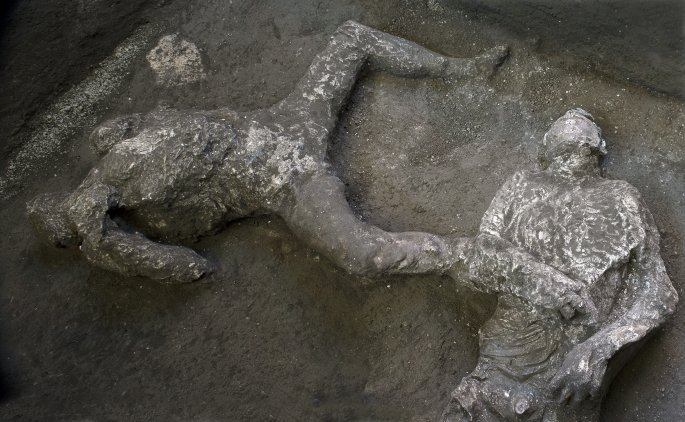 Αρχαιολόγοι ανακάλυψαν τα πολύ καλά διατηρημένα λείψανα δύο ανδρών που κάηκαν ζωντανοί κατά την έκρηξη του ηφαιστείου, το οποίο κατέστρεψε ολοσχερώς την αρχαία πόλη της Πομπηίας το 79 μ.Χ., ανακοίνωσε σήμερα ο υπουργός Πολιτισμού της χώρας. Ο ένας εξ αυτών ήταν πιθανόν ένας άνδρας υψηλού στάτους, ηλικίας μεταξύ 30 και 40 ετών, που έφερε ίχνη ενός μάλλινου μανδύα κάτω από τον λαιμό του. Ο δεύτερος, πιθανόν ηλικίας 18-23 ετών, ήταν ντυμένος με έναν χιτώνα και είχε αρκετούς σπασμένους σπονδύλους, κάτι που δείχνει πως ήταν σκλάβος, ο οποίος έκανε βαριές δουλειές.