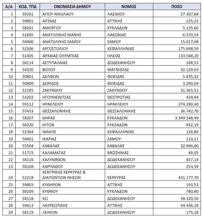 Είναι χαρακτηριστικό ότι από τα 9.775.519,24€ τα οποία αποτελούν το ποσό της επιχορήγησης που πρόκειται να δοθεί στους Δήμους ολόκληρης της ελληνικής επικράτειας, η Μύκονος και η Σαντορίνη θα εισπράξουν 6.694.071,81€.