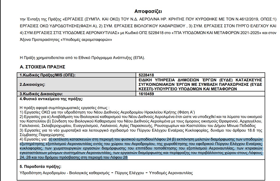 Όπως αποκαλύπτει το creta24.gr, ο υπουργός Υποδομών Χρίστος Δήμας υπέγραψε τη χρηματοδότηση για μία σειρά από συμπληρωματικά έργα στο νέο αεροδρόμιο.