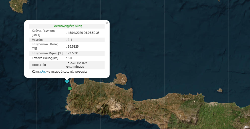 Ο σεισμός μεγέθους 3,1 Ρίχτερ, σημειώθηκε στις 8:06, με το επίκεντρο να εντοπίζεται στη θαλάσσια περιοχή 5 Χλμ. βορειοδυτικά των Φαλασάρνων.