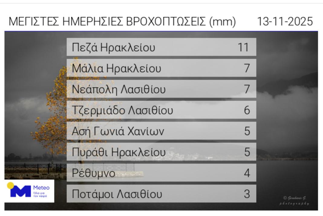 Μόνο περιοχές της Κρήτης, υπάρχουν στον πίνακα του Meteo αναφορικά με τα μεγαλύτερα ύψη βροχής της ημέρας.