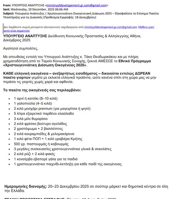 Το νου σας! Πρέπει όλοι να προσέχετε, διότι ακόμη ένα παραπλανητικό e-mail εντοπίστηκε να διακινείται τις τελευταίες μέρες, αυτή τη φορά έχοντας τη μορφή δήθεν κρατικού προγράμματος που υπόσχεται δωρεάν γιορτινό πακέτο από το Υπουργείο Ανάπτυξης με τον τίτλο «Χριστουγεννιάτικη Διάσωση Οικογένειας 2025». Ήδη έχει σταλεί και σε πολλούς κρητικούς!