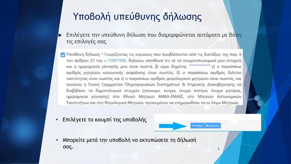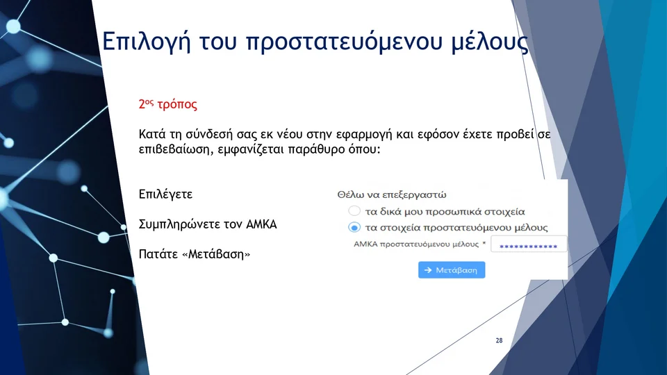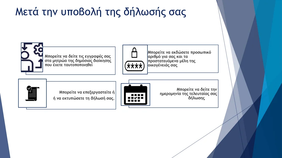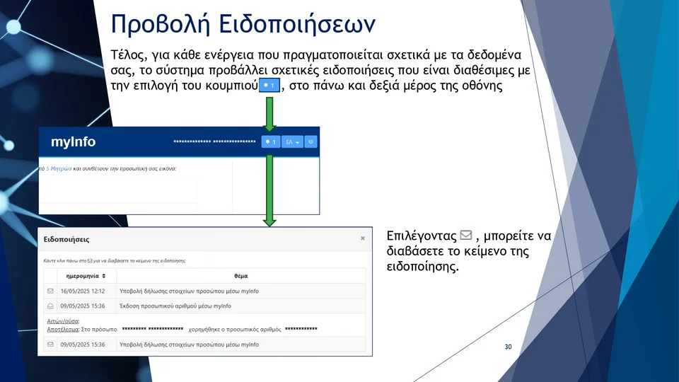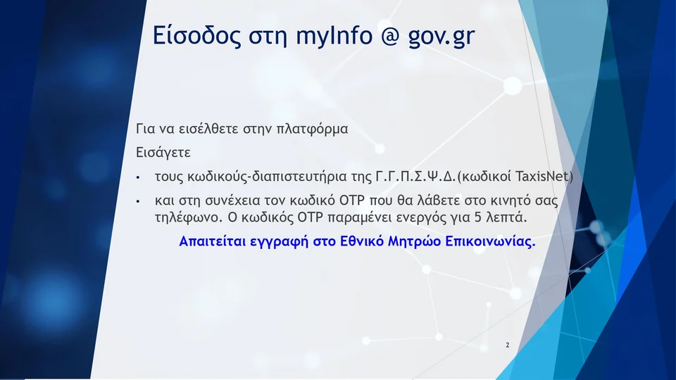 Eισέρχονται στην εφαρμογή myinfo με χρήση των κωδικών TaxisNet και χρήση δεύτερου παράγοντα ταυτοποίησης (OTP), που λαμβάνουν στο κινητό που έχουν καταχωρίσει στο Εθνικό Μητρώο Επικοινωνίας (ΕΜΕπ – emep.gov.gr).