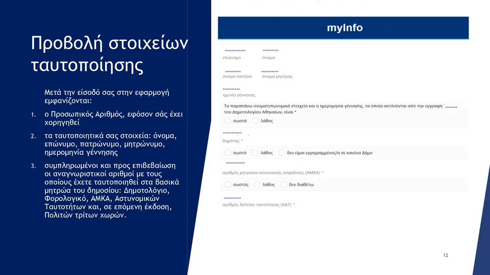 Μέσω της εφαρμογής, αποκτούν μια ολοκληρωμένη εικόνα των στοιχείων τους με βάση το Μητρώο Πολιτών και επιβεβαιώνουν τους αναγνωριστικούς αριθμούς που συνδέονται με τα μητρώα: α) Μητρώο Πολιτών του Υπουργείου Εσωτερικών, β) Φορολογικό Μητρώο της Ανεξάρτητης Αρχής Δημοσίων Εσόδων (Α.Α.Δ.Ε.), γ) Ενιαίο Μητρώο Α.Μ.Κ.Α.-Ε.Μ.Α.Ε.Σ. της Ηλεκτρονικής Διακυβέρνησης Κοινωνικής Ασφάλισης (Η.Δ.ΙΚ.Α.) Α.Ε., δ) Μητρώο Δελτίων Ταυτότητας Ελλήνων Πολιτών που τηρεί η Ελληνική Αστυνομία (ΕΛ.ΑΣ.), ε) ΕΜΕπ (emep.gov.gr) που τηρεί η Γενική Γραμματεία Πληροφοριακών Συστημάτων και Ψηφιακής Διακυβέρνησης.