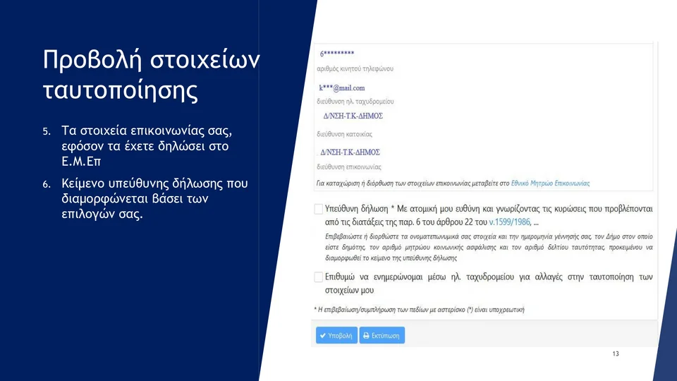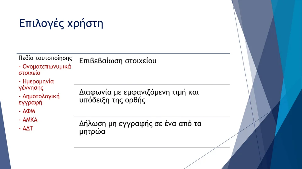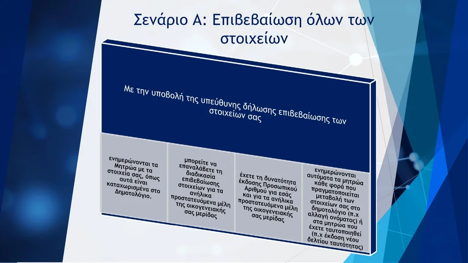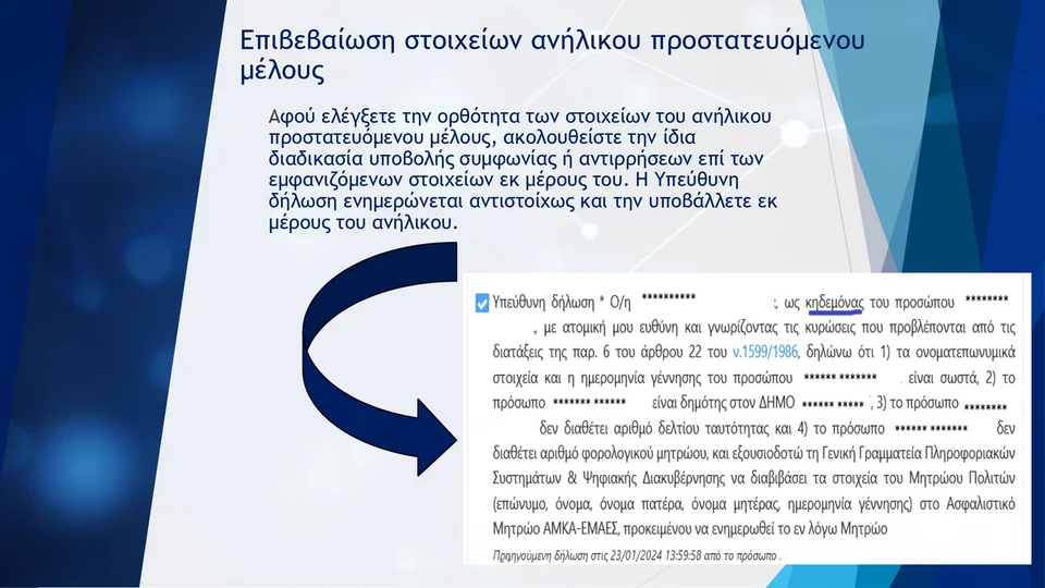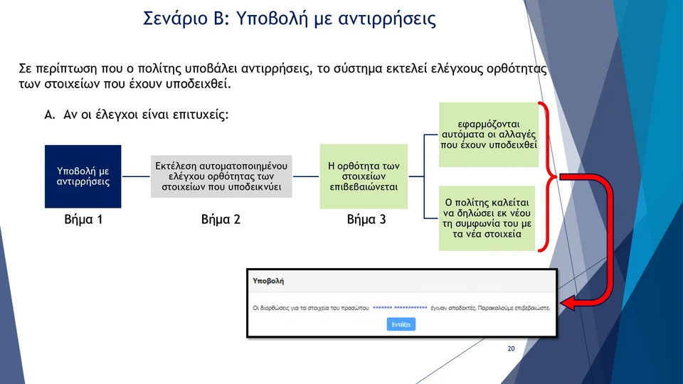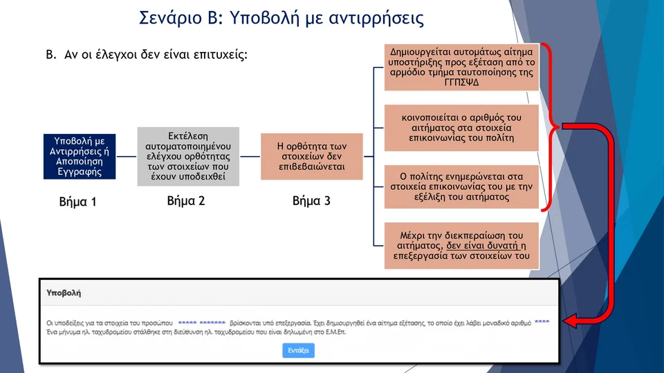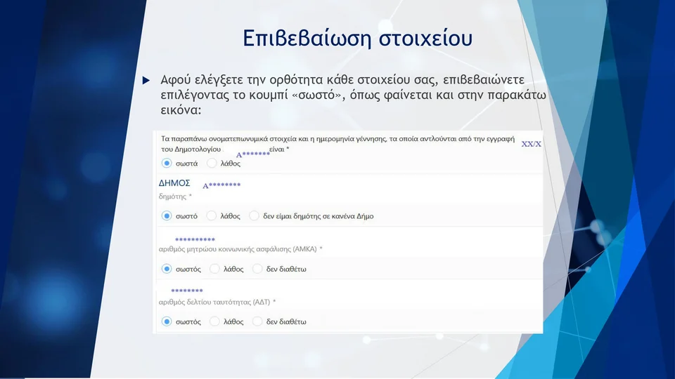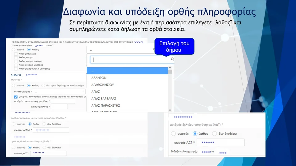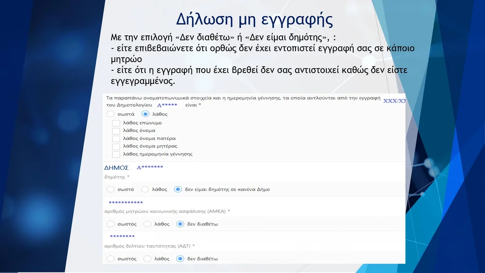 5. Ο πολίτης επιβεβαιώνει τα ορθά ονοματεπωνυμικά στοιχεία του και ημερομηνία γέννησης, Δήμο, ΑΜΚΑ και ΑΔΤ και στην συνέχεια ενημερώνονται τα βασικά μητρώα της Δημόσιας Διοίκησης. Σε περίπτωση όμως που τα στοιχεία που υποδεικνύει δεν ταυτίζονται με αυτά στο Μητρώο Πολιτών και ο πολίτης θεωρεί ότι δεν έχουν καταγραφεί εκεί ορθά, θα πρέπει να απευθυνθεί στο Δημοτολόγιο του Δήμου που ανήκει για να τα διορθώσει.
