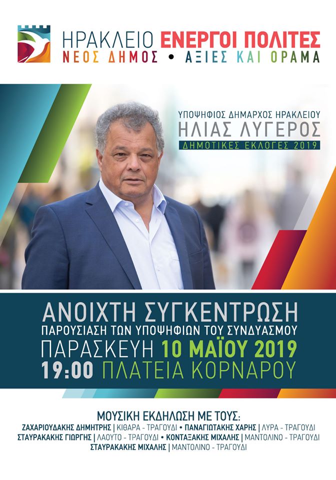 Την πρώτη ανοικτή προεκλογική συγκέντρωση της θα πραγματοποιήσει η Δημοτική Κίνηση «Ηράκλειο Ενεργοί Πολίτες» και ο επικεφαλής της Ηλίας Λυγερός σήμερα στις 7 το απόγευμα στην πλατεία Κορνάρου.