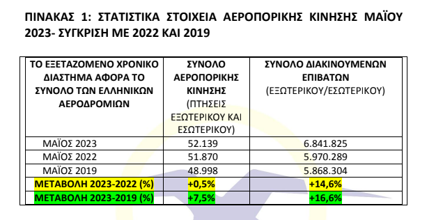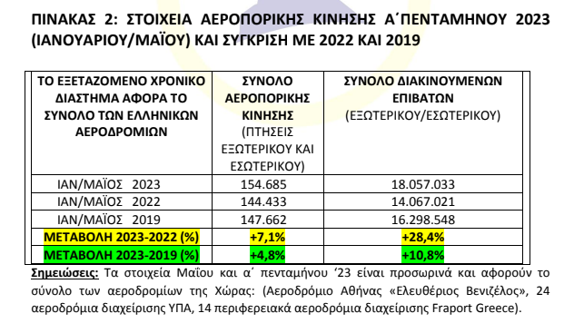 Ειδικότερα, για το πρώτο πεντάμηνο του έτους στην Ελλάδα (Ιανουάριος/Μάιος 2023) το σύνολο των διακινούμενων επιβατών στα αεροδρόμια, (αφίξεις και αναχωρήσεις επιβατών εξωτερικού και εσωτερικού), έφτασε τα 18.057.033, έναντι 14.067.021 το αντίστοιχο διάστημα του 2022 και 16.298.548 επιβατών το 2019. Από τα ανωτέρω στατιστικά στοιχεία, προκύπτει αύξηση επιβατικής κίνησης +28,4% σε σχέση με το 2022 και αύξηση +10,8% σε σχέση με το 2019.