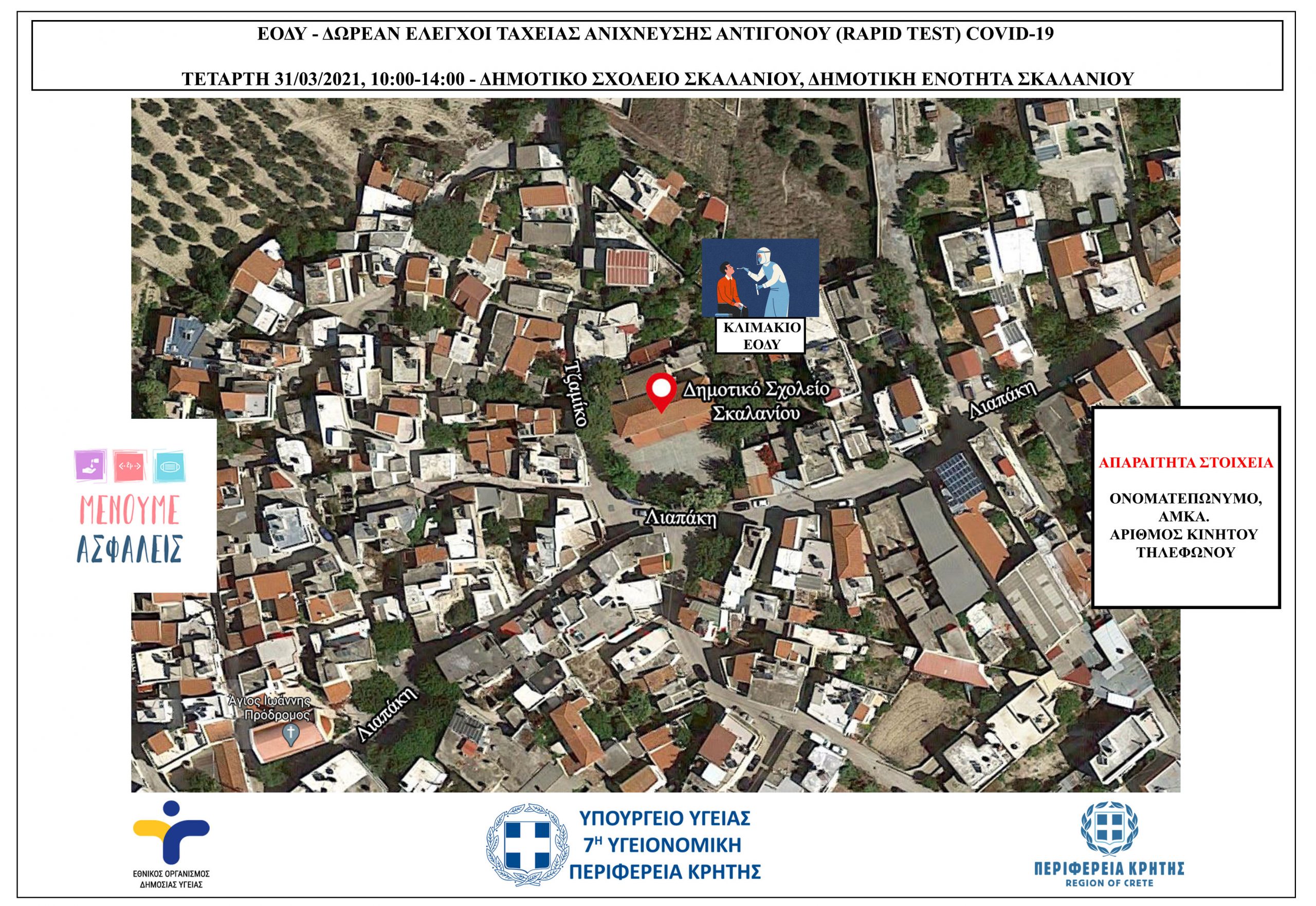 Οι δειγματοληψίες θα διεξαχθούν στο Δημοτικό Σχολείο Σκαλανίου, από τις 10:00 έως τις 14:00, όπως απεικονίζεται στον χάρτη.