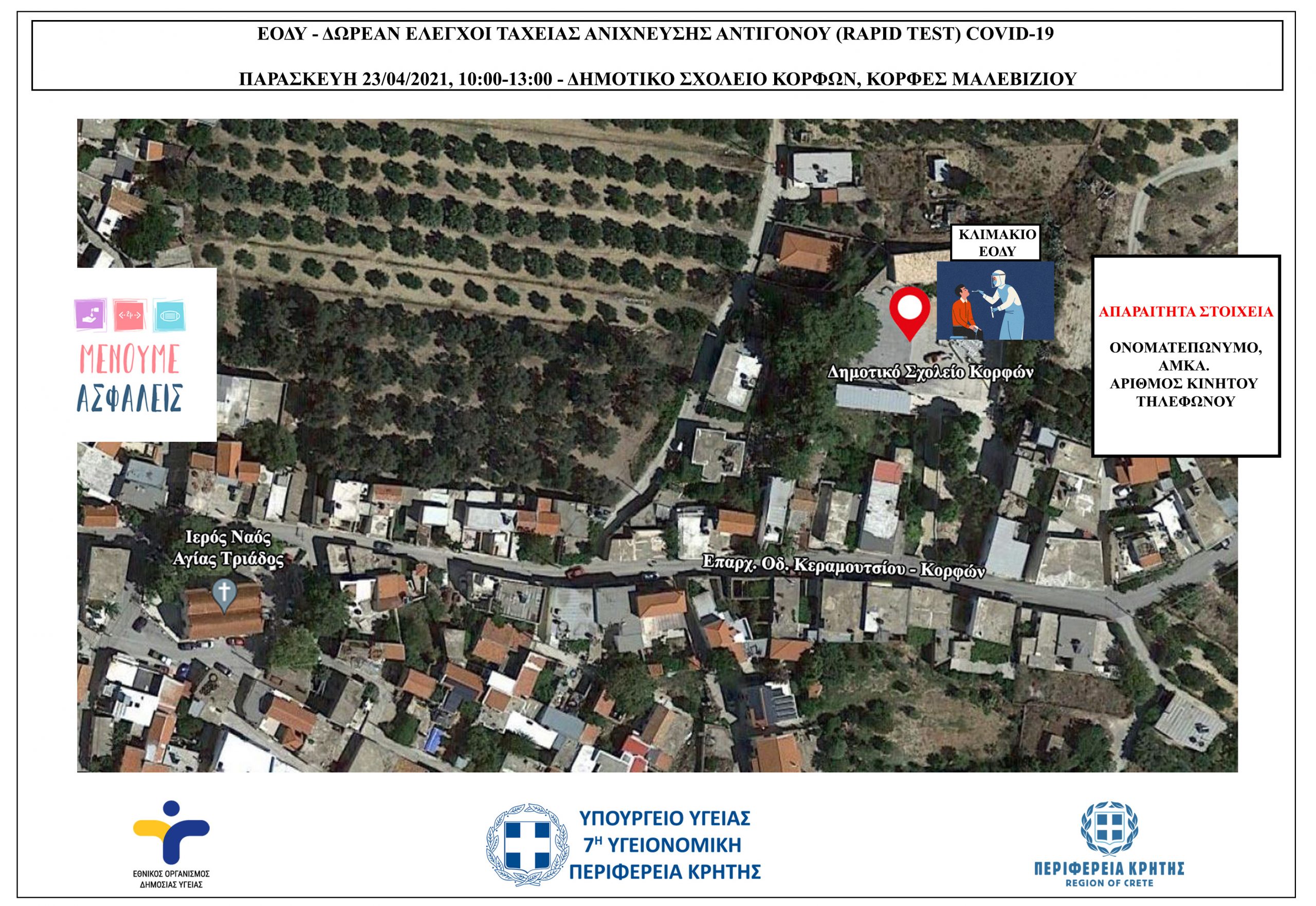 Έλεγχοι ταχείας ανίχνευσης αντιγόνου Covid-19 (rapid test) σε πεζούς θα πραγματοποιηθούν την Παρασκευή 23/04/2021 από κλιμάκια του ΕΟΔΥ στις Κορφές Ηρακλείου.
