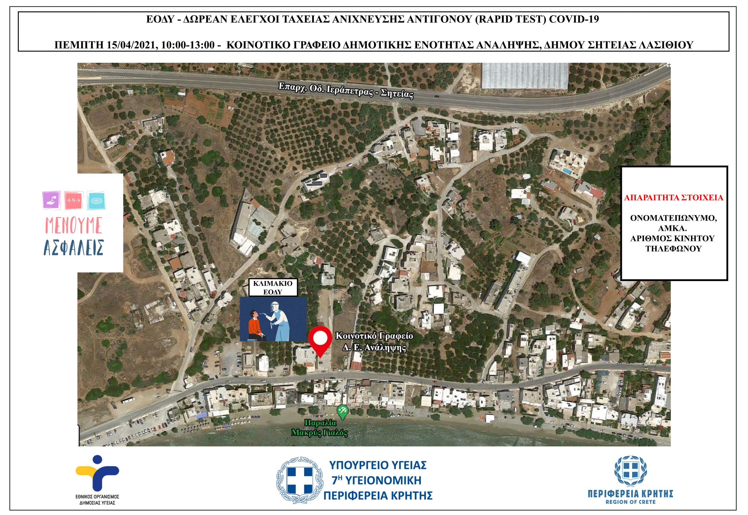 Οι δειγματοληψίες θα διεξαχθούν στο Κοινοτικό Γραφείο της Δημοτικής Ενότητας Ανάληψης του Δήμου Σητείας, από τις 10:00 έως τις 13:00, όπως απεικονίζεται στον επισυναπτόμενο χάρτη.