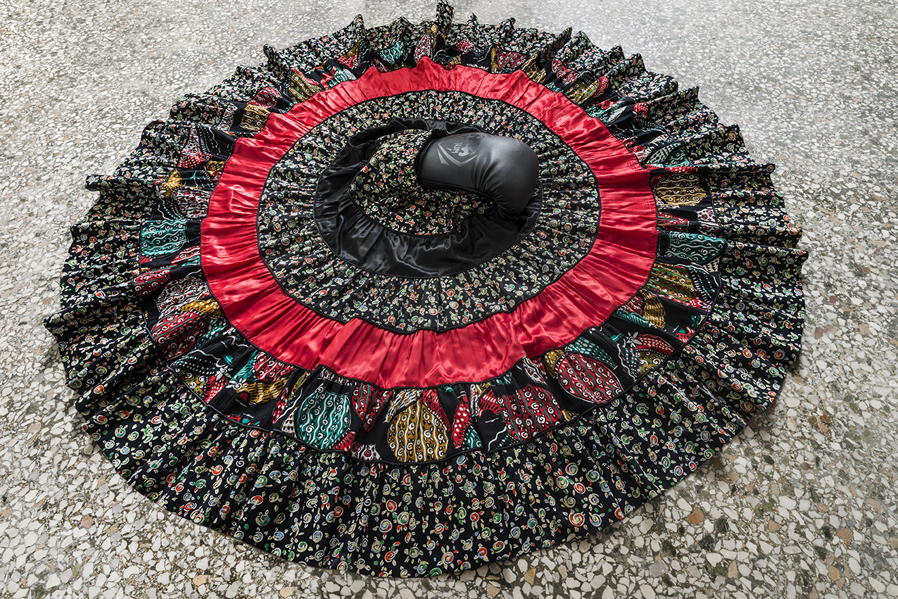 Lydia Dambassina, Untitled, 2018, detail, boxing glove, fabric skirt, diameter 150cm, photo © Manolis Baboussis