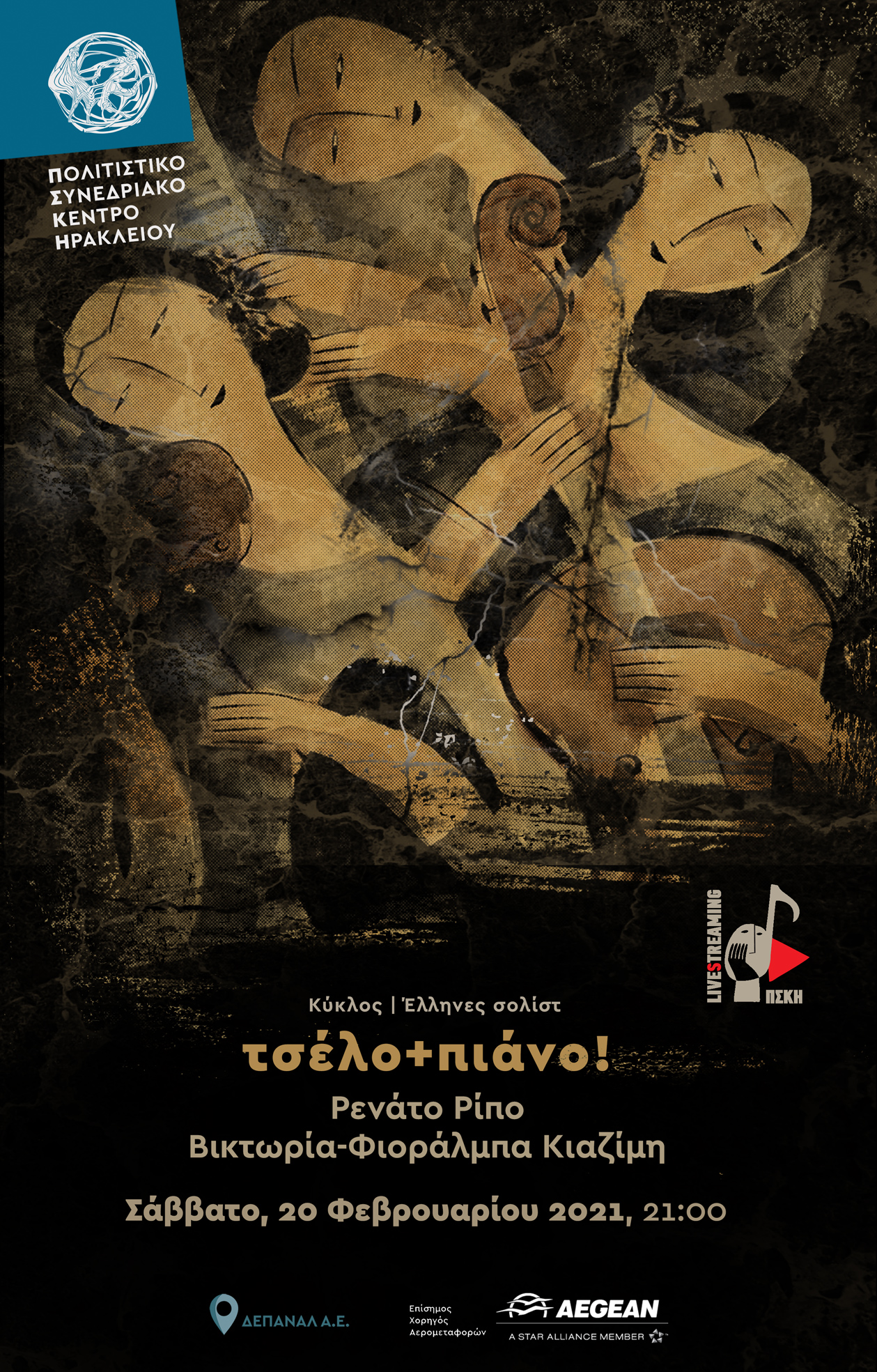 Δύο φωτεινοί, χαρισματικοί και επιφανείς σολίστ, ο διεθνούς φήμης τσελίστας Ρενάτο Ρίπο και η καταξιωμένη πιανίστα Βικτωρία-Φιοράλμπα Κιαζίμη, ερμηνεύουν ένα συναρπαστικό πρόγραμμα με έργα για τσέλο και πιάνο, συνδέοντας τον λυρισμό της μουσικής γλώσσας των Μax Bruch (1838-1920), Zoltán Kodály (1882-1967) και Robert Schumann (1810-1856) με το πολύχρωμο φολκλόρ των ισπανικών μελωδιών του Manuel de Falla (1876-1946) και το πνεύμα του φλεγόμενου nuevo tango του Ástor Piazzolla (1921-1992).