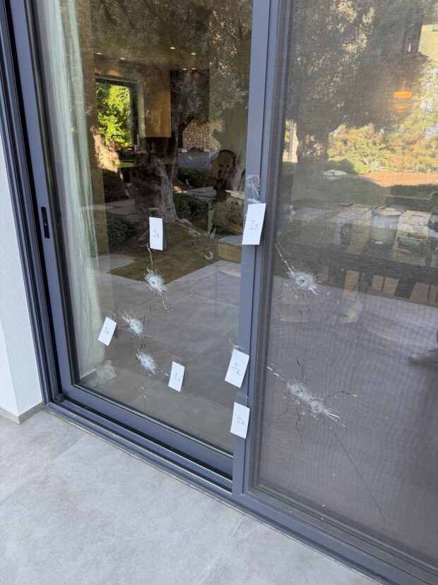 Οι σφαίρες χτύπησαν μπαλκονόπορτα σαλονιού και μπαλκονόπορτα κουζίνας ενώ οι δράστες άφησαν ένα μαύρο στεφάνι στην κεντρική είσοδο ως μήνυμα. Τα μέχρι στιγμής στοιχεία παραπέμπουν σε ενέργεια προειδοποιητικού χαρακτήρα με τις αρχές να εξετάζουν προσεκτικά κάθε ενδεχόμενο.
