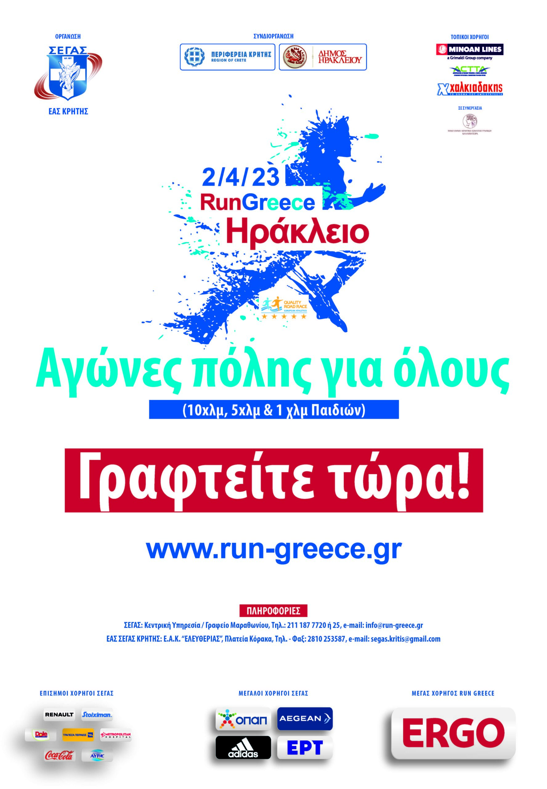 Το «RUN GREECE Ηράκλειο» έχει μεγάλο χορηγό την Ergo Ασφαλιστική, τοπικούς χορηγούς τις Μινωικές Γραμμές, το Σύνδεσμο Τουριστικών και Ταξιδιωτικών Γραφείων Κρήτης, τα Super Market Χαλκιαδάκης και διεξάγεται με τη συνεργασία του Πανελλήνιου Αθλητικού Σωματείου Γυναικών Καλλιπάτειρα.