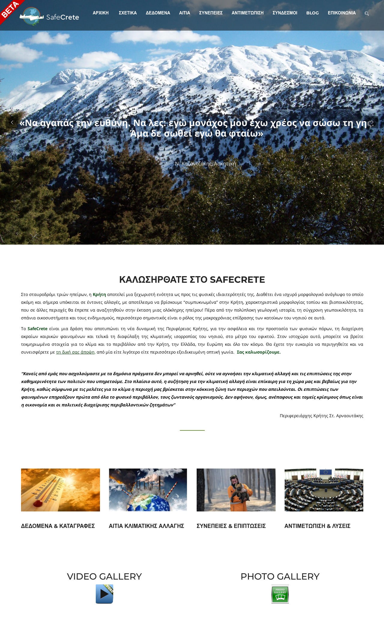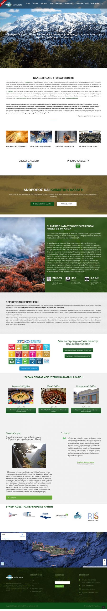 Με γνώμονα τα παραπάνω, η Περιφέρεια Κρήτης δημιούργησε το www.safecrete.gr ένα ιστοχώρο με την τεχνική υπογραφή της Διεύθυνσης Ηλεκτρονικής Διακυβέρνησης της Περιφέρειας, ο οποίος περιέχει τεκμηριωμένα στοιχεία και πληροφορίες που αφορούν την κλιματική αλλαγή, τα αίτια και τις συνέπειές της. Ο σκοπός του SafeCrete, είναι μέσω της ενημέρωσης και της διάδρασης, να δημιουργήσει το υπόβαθρο γνώσης, ώστε η κοινωνία να προσαρμοστεί και τελικά να ανταποκριθεί στους κινδύνους που αντιμετωπίζει. Η Αυτοδιοίκηση, εκτός από την ετοιμότητα στη διάρκεια της φυσικής καταστροφής, δίνει τώρα περισσότερο βάρος στα στάδια της πρόληψης και της προετοιμασίας. Για την εξασφάλιση ετοιμότητας και ανταπόκρισης του νησιού σε αιφνίδιες αλλαγές, οφείλουν ωστόσο και οι ίδιοι οι πολίτες να συμμετέχουν. Μέσα από την ενημέρωση, την ευαισθητοποίηση, τη γνώση και τη διάδοση της ιδέας στις τοπικές κοινωνίες, θα μπορέσουν οι πολίτες να προετοιμαστούν κατάλληλα.