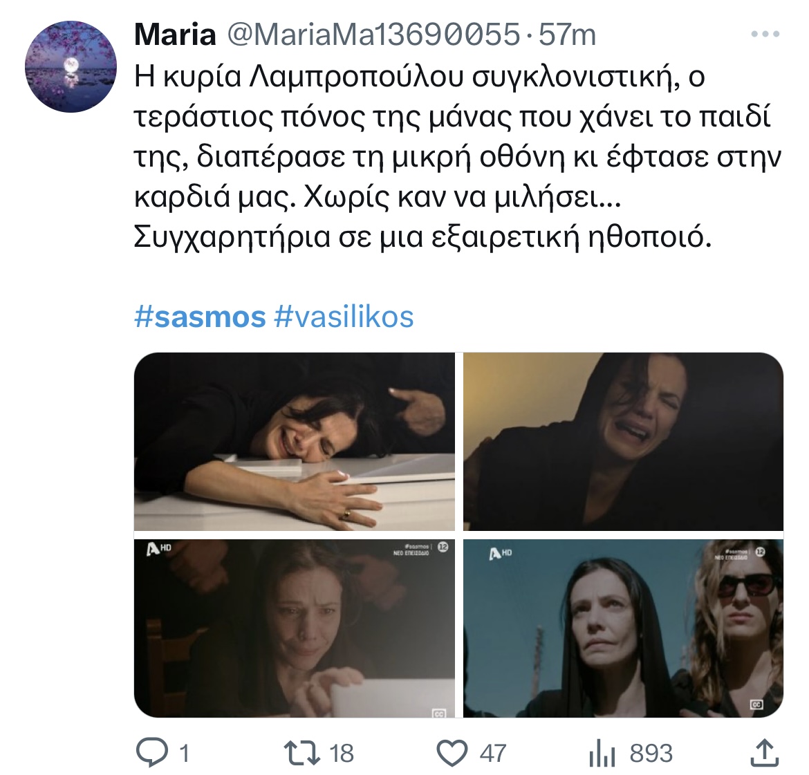 Ένα συγκλονιστικό επεισόδιο, ένα επεισόδιο με σπαρακτικές ερμηνείες, που καθήλωσαν, συγκίνησαν κι έκαναν το Twitter να υποκλιθεί, ήταν το επεισόδιο της Δευτέρας του «Σασμού», οπότε παρουσιάστηκε η κηδεία του αδικοχαμένου Νικηφόρου.
