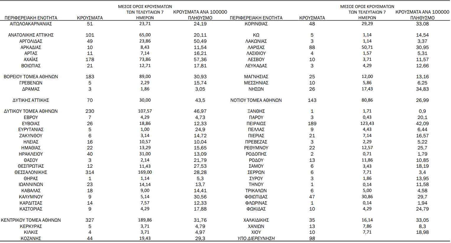 Την ίδια ώρα, η Αχαΐα σημειώνει 183 κρούσματα του νέου κορωνοϊού, ενώ η Θεσσαλονίκη βρίσκεται για δεύτερη συνεχόμενη ημέρα πάνω από τα 300 περιστατικά, με 314 μολύνσεις το τελευταίο 24ωρο. Τέλος, 88 περιστατικά αναφέρει ο ΕΟΔΥ στη Λάρισα, 47 στη Φθιώτιδα, 49 στην Αργολίδα και 44 στην Κοζάνη.