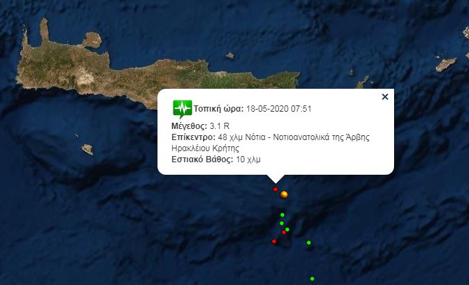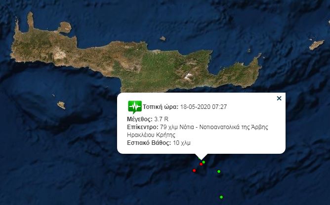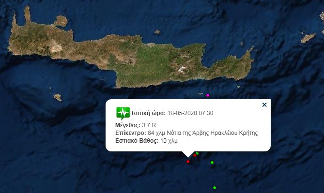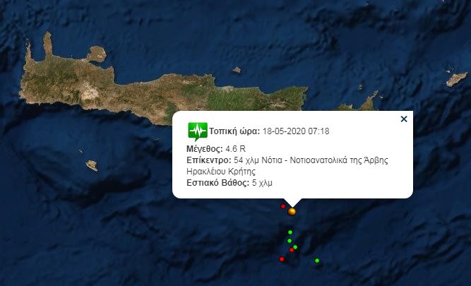 Ο σεισμός σημειώθηκε στις 7:18 και ήταν μεγέθους 4,6 Ρίχτερ. Το επίκεντρο της δόνησης εντοπίζεται στον θαλάσσιο χώρο 54 χιλιόμετρα νότια/νοτιοανατολικά της Άρβης στην Κρήτη, στην περιοχή που είχε σημειωθεί ο μεγάλος σεισμός των 6 Ρίχτερ.