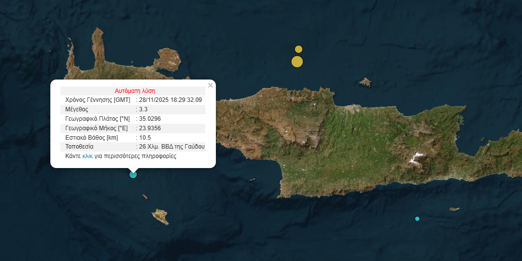 Σύμφωνα το Γεωδυναμικό Ινστιτούτο, ο σεισμός σημειώθηκε στις 20:29 μ.μ. στη θαλάσσια περιοχή 26 χιλιόμετρα βόρεια – βορειοδυτικά της Γαύδου.