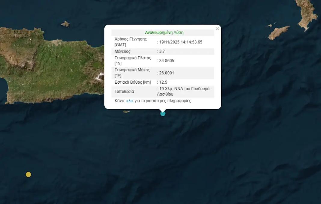 Σεισμός μεγέθους 3,7 βαθμών της κλίμακας ρίχτερ σημειώθηκε στο Λασίθι το απόγευμα της Τετάρτης (19/11).
