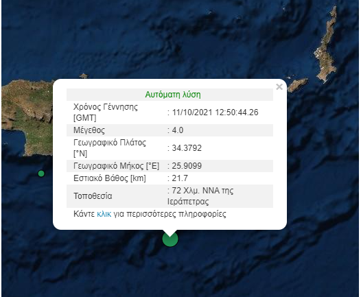 Ο νέος σεισμός μεγέθους 4 Ρίχτερ σημειώθηκε 72 χλμ νότια νοτιοανατολικά της Ιεράπετρας σε εστιακό βάθος 4 χλμ.
