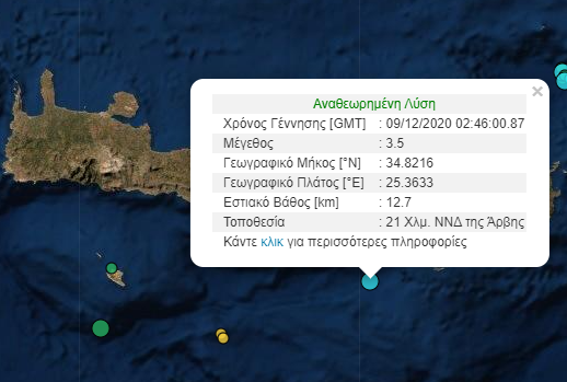 ΚΡΗΤΗΚΟΙΝΩΝΙΑ Σεισμός τα ξημερώματα στην Κρήτη Τετάρτη 9 Δεκ 2020 | 08:13 FacebookTwitterViberWhatsAppEmailCopy URL Πρέπει να διαβάσετε Σεισμική δόνηση έντασης 3,5 βαθμών της κλίμακας Ρίχτερ σημειώθηκε τα ξημερώματα, νότια της Κρήτης. Ο σεισμός σημειώθηκε στις 4:46, 21 χλμ. νότια- νοτιοδυτικά της Άρβης, ενώ το εστιακό του βάθος υπολογίζεται στα 12,7 χλμ. ΕτικέτεςΔΗΜΟΦΙΛΗ Σχετικά άρθρα Αυτοψία Καλοκαιρινού στο έργο κατασκευής της νέας Μονάδας Επεξεργασίας Απορριμμάτων Ηρακλείου Παρασκευή 16 Ιαν 2026 | 13:07 Θλίψη για την σπουδαία Κρητικιά αναισθησιολόγο που έφυγε από τη ζωή Παρασκευή 16 Ιαν 2026 | 12:48 «Κλείδωσε» η ημερομηνία για τη Σύνοδο της Εκκλησίας Κρήτης και την εκλογή των δύο Μητροπολιτών Παρασκευή 16 Ιαν 2026 | 12:20 ΠΑΓΝΗ: Διασωληνωμένη και σε σταθερή κατάσταση η γιατρός με την μηνιγγίτιδα Παρασκευή 16 Ιαν 2026 | 11:47 Άλλα Πρόσφατα Αυτοψία Καλοκαιρινού στο έργο κατασκευής της νέας Μονάδας Επεξεργασίας Απορριμμάτων Ηρακλείου Παρασκευή 16 Ιαν 2026 | 13:07 Γρατσία για κόμμα Καρυστιανού: Τα πρόσωπα υπάρχουν ήδη, εκτιμώ ότι το πρόγραμμα θα είναι έτοιμο τον επόμενο μήνα Παρασκευή 16 Ιαν 2026 | 12:58 Θλίψη για την σπουδαία Κρητικιά αναισθησιολόγο που έφυγε από τη ζωή Παρασκευή 16 Ιαν 2026 | 12:48 Συνελήφθη γνωστό μοντέλο για συμμετοχή σε συμμορία ένοπλων ληστειών στην Αττική -Ο ρόλος της Παρασκευή 16 Ιαν 2026 | 12:39 Τι είναι η μέθοδος «SMS blaster» -Ετσι οι δύο Κινέζοι άρπαζαν τραπεζικά δεδομένα από κινητά πολιτών στην Αττική Παρασκευή 16 Ιαν 2026 | 12:32