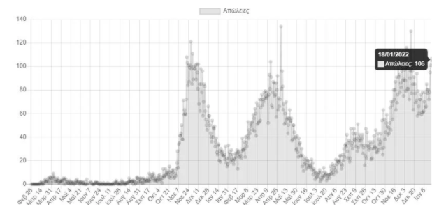 Χαρακτηριστικό είναι ότι από 1 έως 18 Ιανουαρίου του 2022 έχουν συνολικά καταγραφεί από τον Εθνικό Οργανισμό Δημόσιας Υγείας 1.374 θάνατοι από covid-19, με αποκορύφωμα όπως προαναφέρθηκε τη χθεσινή ημέρα.