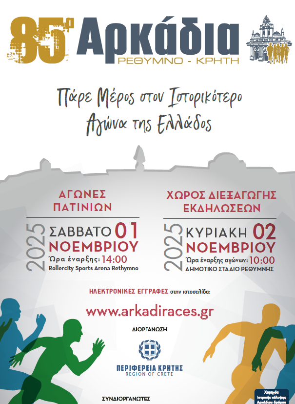 Το Ρέθυμνο ετοιμάζεται να φιλοξενήσει για ακόμη μία χρονιά τη μεγάλη αθλητική και πολιτιστική γιορτή των Αρκάδιων Αγώνων, που φέτος συμπληρώνουν 85 χρόνια ιστορίας. Οι αγώνες θα διεξαχθούν την Κυριακή 2 Νοεμβρίου 2025, με ώρα έναρξης 12.00, στο Δημοτικό Στάδιο Ρεθύμνης (Σοχώρα), ενώ οι ηλεκτρονικές εγγραφές πραγματοποιούνται στην ιστοσελίδα www.arkadiraces.gr.